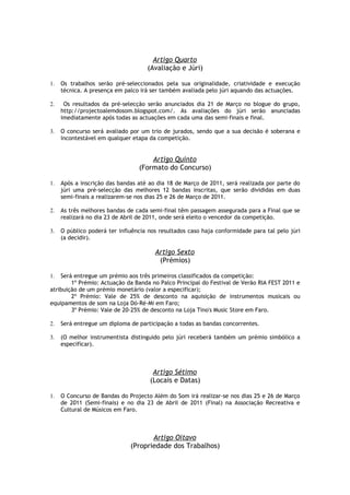 O concurso de bandas, promovido pelo 'projecto além do som', está aberto a grupos musicais com inscrições até 18 de março de 2011, e inclui pré-seleção e semifinais nos dias 25 e 26 de março, culminando em uma final em 23 de abril de 2011. Os prêmios incluem atuações em festivais e descontos na compra de instrumentos. A participação requer o envio de uma maqueta e o cumprimento de normas para evitar desclassificação.