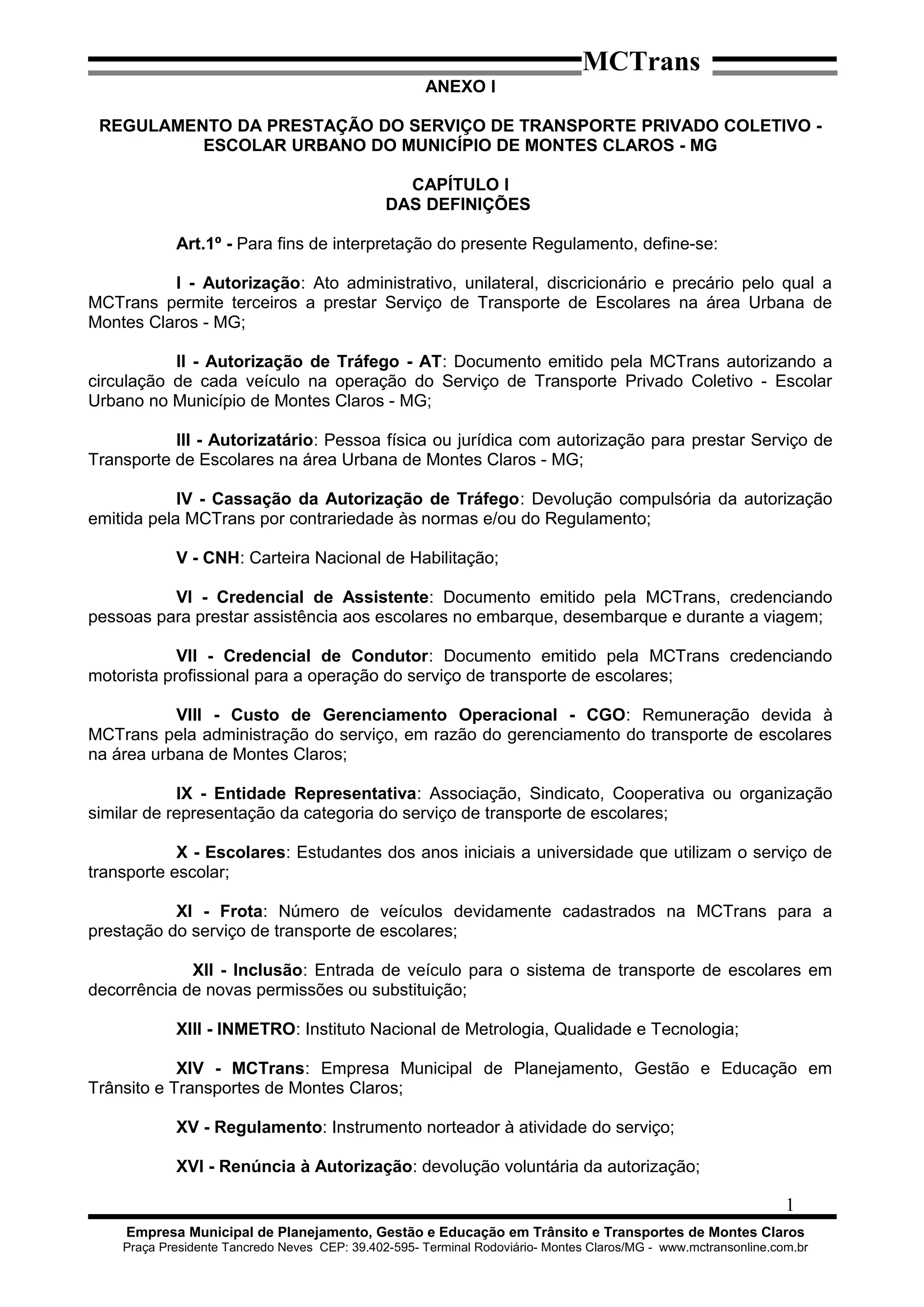 Este documento define os termos e regulamentos para o serviço de transporte escolar urbano na cidade de Montes Claros, MG. Estabelece as definições de termos como autorização, autorizatário, condutor, veículo, entre outros. Também descreve os requisitos para cadastramento e credenciamento de veículos, condutores e assistentes no sistema de transporte escolar da cidade.