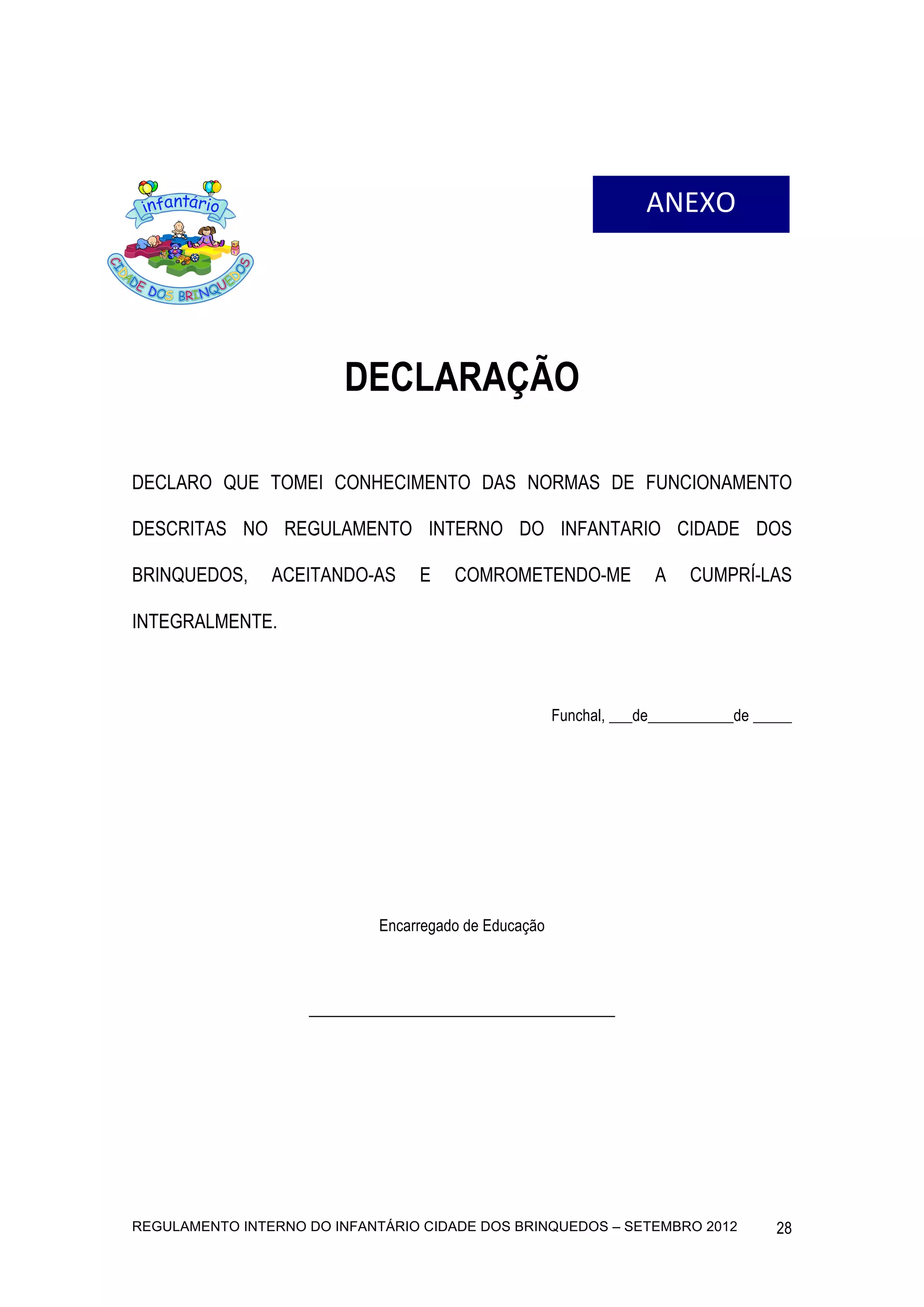 Este documento é o regulamento interno de um infantário chamado Cidade dos Brinquedos. Ele estabelece normas sobre funcionamento, alimentação, vestuário, higiene, aniversários, reclamações e outras situações. O regulamento também descreve o horário das refeições para diferentes grupos de idade no infantário.