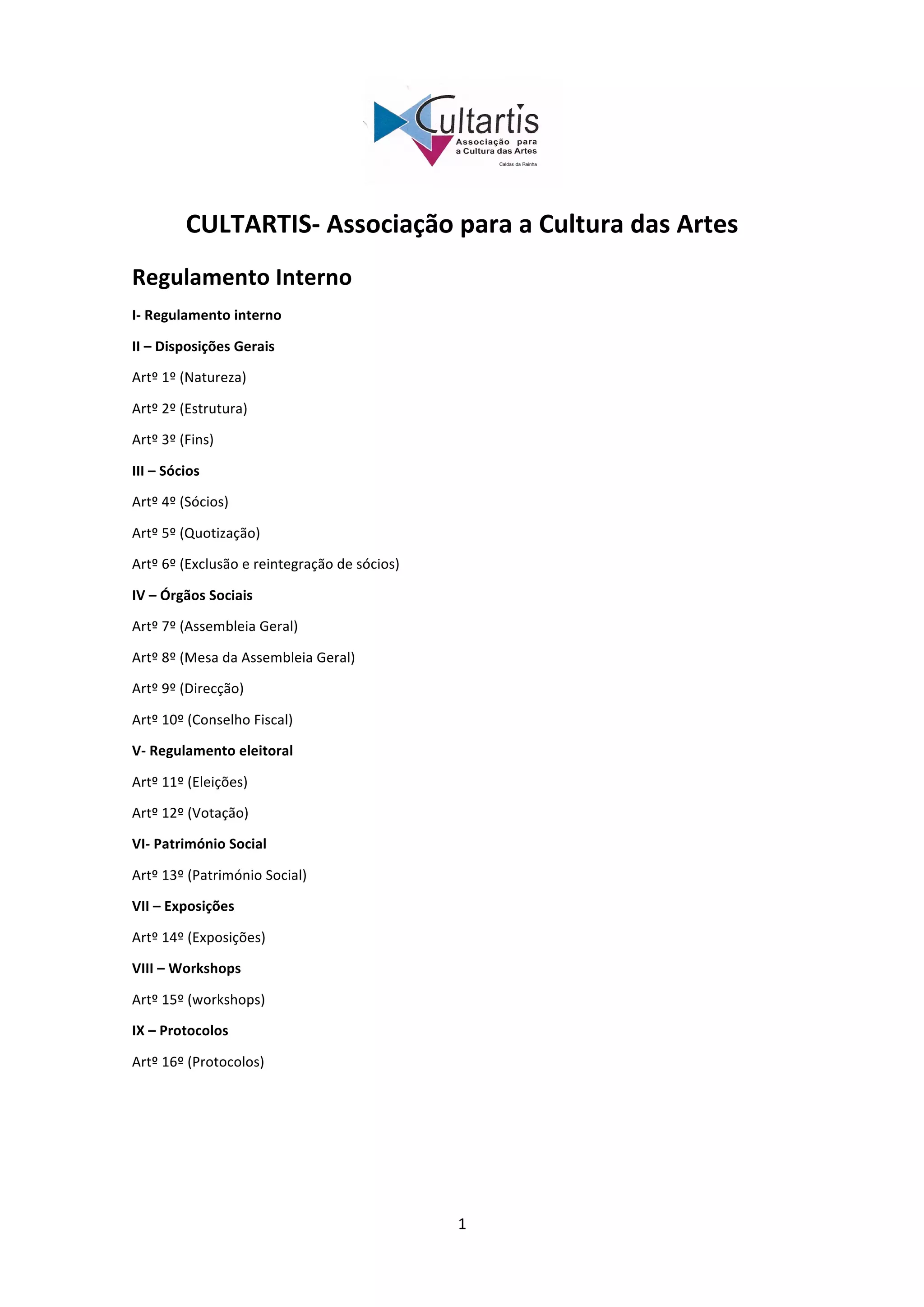 O regulamento interno da Cultartis define a natureza e estrutura da associação, bem como os direitos e deveres dos sócios e a organização dos órgãos sociais. Ele estabelece normas para a admissão, exclusão e reintegração de sócios, além de procedimentos para a realização de assembleias gerais e processos eleitorais. Adicionalmente, cobre aspectos relacionados ao património social e à realização de exposições e workshops.