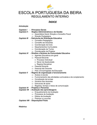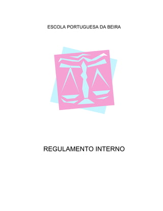 Este documento apresenta o regulamento interno da Escola Portuguesa da Beira em Moçambique. Estabelece a estrutura organizacional e administrativa da escola, incluindo seus órgãos de gestão como a Assembleia Geral, Direção e Conselho Fiscal. Também define as estruturas de orientação educativa como o Conselho Pedagógico, departamentos curriculares e conselhos de turma, além dos direitos e deveres da comunidade escolar.