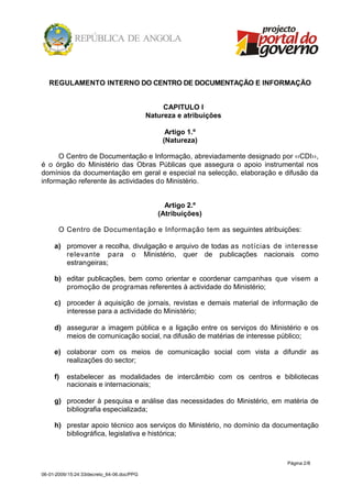 Este documento regulamenta a estrutura e funcionamento do Centro de Documentação e Informação do Ministério das Obras Públicas, definindo suas atribuições, departamentos, seções e quadro de pessoal.