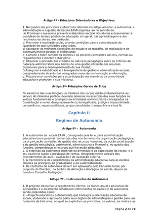 Este documento define o regime de funcionamento de uma escola. Estabelece que o Conselho Geral é o órgão máximo de direção que define as linhas orientadoras da escola e é composto por representantes da comunidade escolar. Também define outros órgãos como o Director e os seus poderes e deveres.