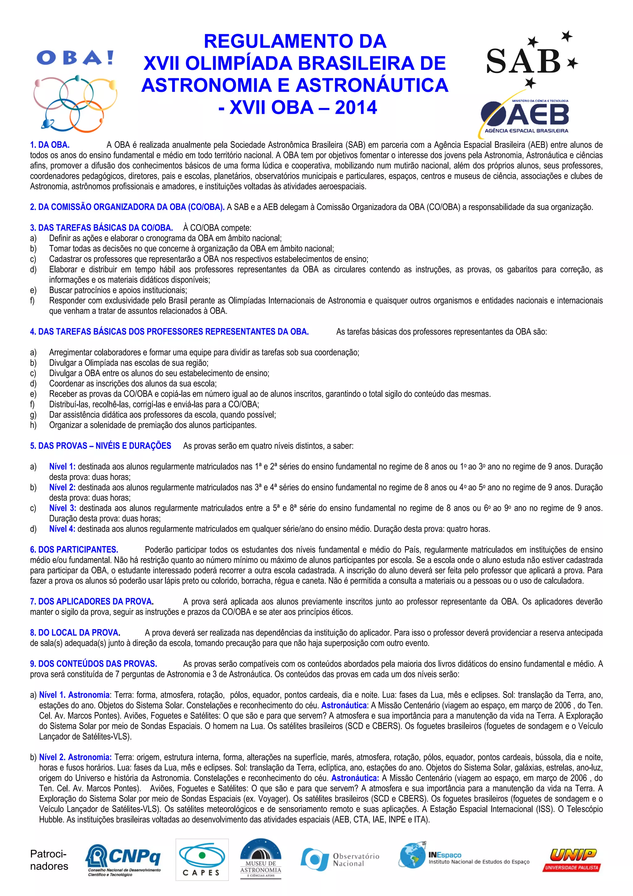 Este documento descreve o regulamento da XVII Olimpíada Brasileira de Astronomia e Astronáutica, realizada anualmente pela Sociedade Astronômica Brasileira e Agência Espacial Brasileira. Ele define as responsabilidades da comissão organizadora, professores, alunos e o processo de aplicação, correção e premiação das provas nos níveis fundamental e médio.