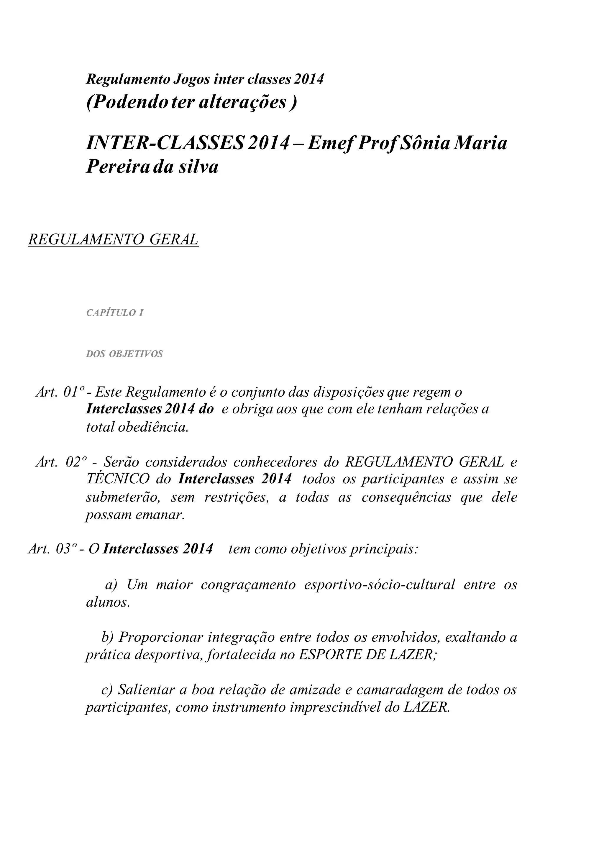 Este regulamento estabelece as regras e objetivos do Interclasses 2014 realizado na Emef Prof Sônia Maria Pereira da Silva. O Interclasses tem como objetivos promover a integração entre os alunos através do esporte e lazer. Serão realizadas competições de futsal e voleibol entre turmas do 6o ao 9o ano entre março e 2014.