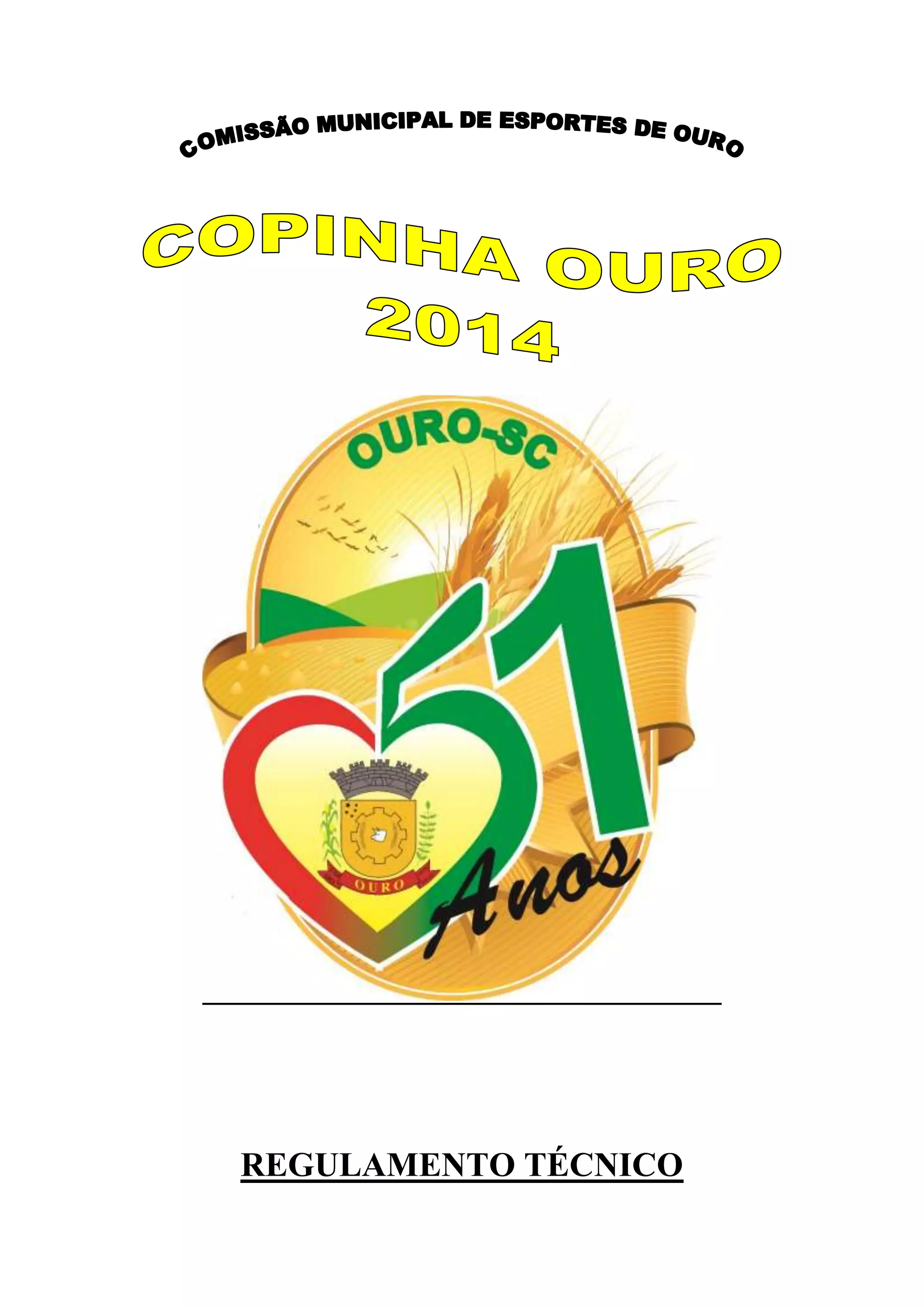 Este regulamento técnico estabelece as regras para o campeonato de futsal de Ouro, incluindo inscrições de equipes e atletas, categorias, uniformes, tempo de jogo, pontuação, cartões, premiação e outras disposições.