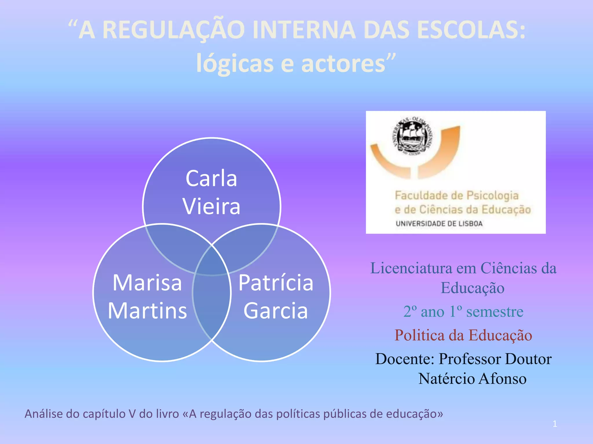 Este documento analisa as lógicas de ação e os atores que regulam internamente duas escolas portuguesas, denominadas Escola Azul e Escola Rosa. A Escola Azul tem uma população escolar de classes sociais mais altas e bons resultados, enquanto a Escola Rosa aceita todos os alunos e se esforça para integrar estudantes de origens diversas. Cada escola tem uma liderança forte e estilos de regulação interna distintos que refletem suas identidades e objetivos educacionais diferentes.