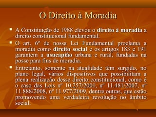 O documento discute o Programa Minha Casa Minha Vida e a Lei 11.977/2009, que instituiu a regularização fundiária e a usucapião administrativa no Brasil. A lei permite que pessoas de baixa renda possam adquirir a propriedade de terras urbanas ocupadas por meio da comprovação de posse prolongada, sem necessidade de processo judicial. Isso viabiliza a implementação do programa habitacional Minha Casa Minha Vida nessas áreas.