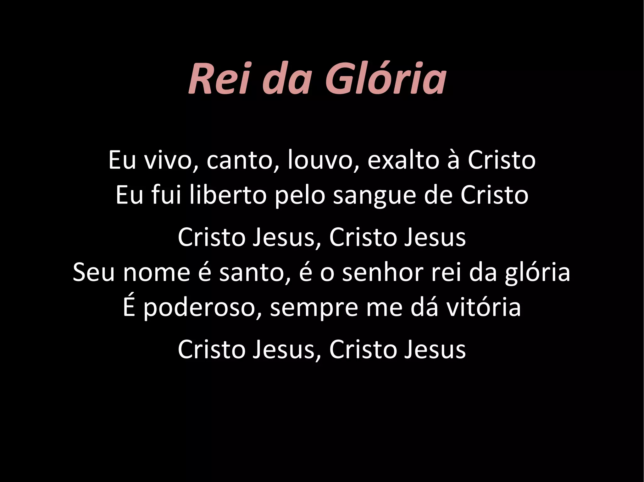 Rei da GlóriaEu vivo, canto, louvo, exalto à Cristo Eu fui liberto pelo sangue de Cristo Cristo Jesus, Cristo Jesus Seu nome é santo, é o senhor rei da glória É poderoso, sempre me dá vitória Cristo Jesus, Cristo Jesus