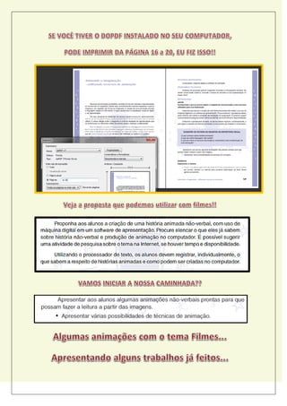 O documento fornece instruções passo-a-passo para criar uma animação GIF a partir de imagens recortadas de um poster do filme Rio. Inclui links para sites com recursos educacionais e sobre animação. Propõe como primeira tarefa recortar imagens do poster para estudar a trajetória da animação e criar uma apresentação no GIF Animator.