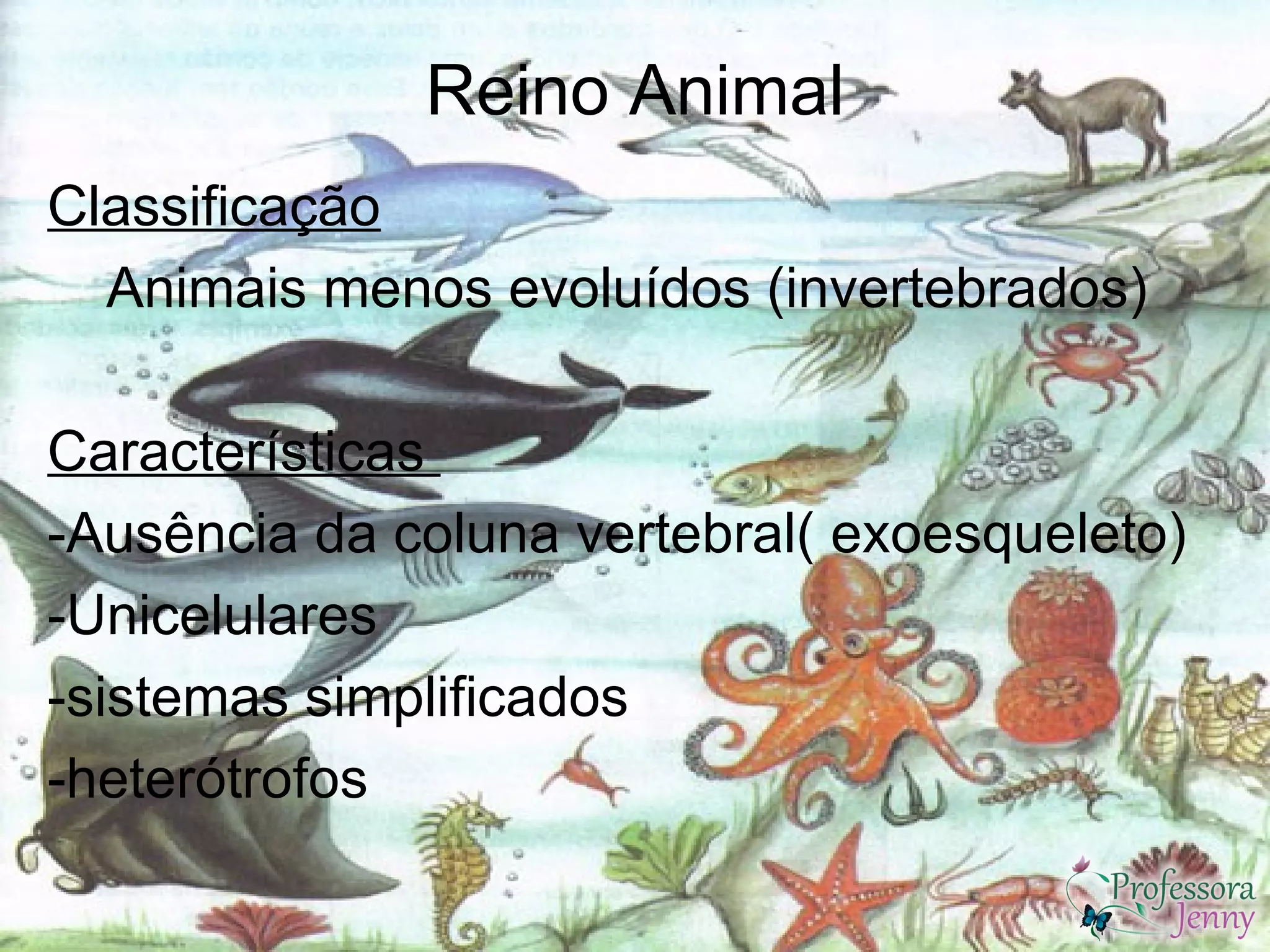 O documento descreve características de diferentes filos do reino animal, incluindo invertebrados marinhos como esponjas, cnidários, platelmintos, asquelmintos e moluscos. Detalha suas classificações, estruturas, reprodução e importância ecológica.