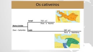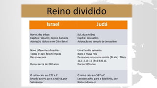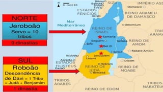 O documento descreve a história do Reino do Norte (Israel) após a divisão dos reinos de Israel e Judá. Detalha os vários reis de Israel, como Acabe, Jezabel, Jorão, Jeú e outros, e como muitos deles desobedeceram a Deus e promoveram a idolatria. Também fala sobre os profetas Elias e Eliseu e seu papel em denunciar a desobediência do povo durante esse período turbulento.