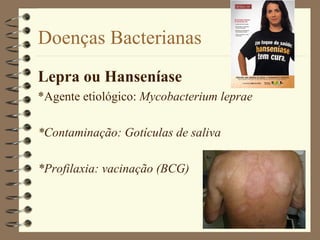 O documento lista várias doenças bacterianas, incluindo leptospirose, hanseníase, tuberculose, botulismo, peste bubônica, sífilis, tétano, meningite meningocócica, cólera e gonorreia. Para cada doença é fornecido o agente etiológico, forma de contaminação e medidas de prevenção.