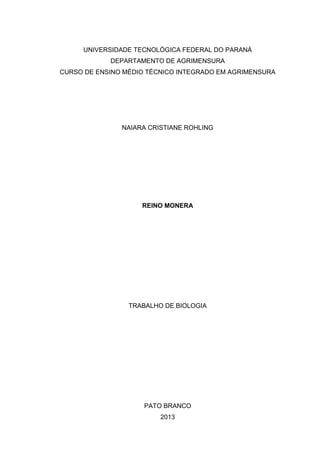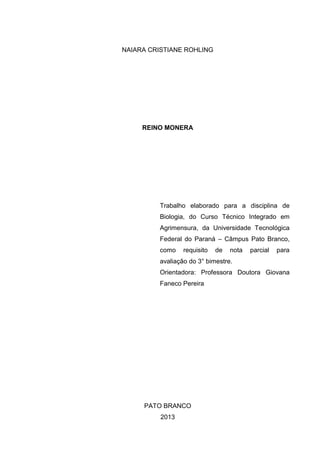 Este documento resume um trabalho sobre o Reino Monera realizado por Naiara Cristiane Rohling para a disciplina de Biologia no Curso Técnico Integrado em Agrimensura da Universidade Tecnológica Federal do Paraná, Campus Pato Branco, em 2013. O trabalho descreve a estrutura e classificação de bactérias, incluindo Arqueobactérias e Eubactérias, além de tratar de curiosidades sobre bactérias e doenças causadas por elas.