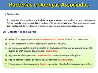 O documento discute bactérias e doenças associadas. Ele define bactérias, descreve suas características gerais e morfologia, incluindo estruturas como cápsula, fímbrias, pili, flagelos, parede celular e membrana celular. Também aborda reprodução bacteriana, doenças causadas por bactérias como difteria, disenteria bacteriana, febre tifóide e tétano.