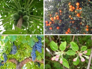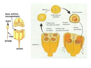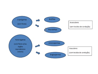 1) O documento descreve as principais características dos reinos das plantas, incluindo briófitas, pteridófitas, gimnospermas e angiospermas.