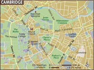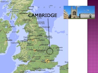 População: 109 milhabitantes, dos quais 22 mil são estudantes universitários. Cambridge está às margens do rio Cam, afluente do rio Ouse, que deságua no Mar do Norte. Na Idade Média, era importante porto fluvial para barcos de pequeno calado, e tornou-se sede de importante feira comercial, graças a comercialização de lã, tecidos e outros produtos agrículos. Século XIII – graças ao seu enriquecimento com o comércio, Cambridge foi se tornando num centro universitário, com a criação dos Colleges. 1209 – Fundação da Universidade de Cambridge, a segunda mais antiga do Reino Unido, e considerada em 2010 a melhor do mundo. Estudaram aqui 82 dos ganhadores de premios Nobel. Isaac Newton foi diplomado por Cambridge, por exemplo. Atualmente tem 8 mil alunos. 1284 - Peterhouse College, o primeiro a ser fundado em Cambridge. Foram criados 19 deles para rapazes e 2 para moças, donde destacam-se o Christ College (onde Erasmo ensinou Teologia), o Kings College e sua belíssima arquitetura com sua capela (foto abaixo), o Queens College, o Trinity College e o Corpus Christi College. A cidade notabilizou-se pelas suas instituições de ensino e deixam as ruas da cidade quase que vazias durante as férias escolares. As escolas da universidade formam as ruas da cidade.