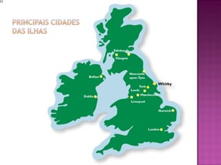 O documento fornece um resumo das informações sobre o Reino Unido, incluindo sua formação por quatro nações, área e população de cada uma, bem como detalhes históricos sobre a formação do reino e da cidade de Londres.