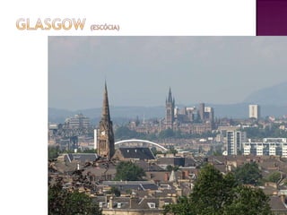 População: 580mil habitantes. Área metropolitana: 1,750 milhões de habitantes ( primeira maior cidade escocesa e a terceira mais populosa do Reino Unido) Localizada nas Lowlands (terras baixas) e as margens do rio Clyde. A cidade cresceu no século XVI, depois da União ao Reino Unido em 1707, graças ao intenso mercado de tabaco com as colonias inglesas da América do Norte. O comércio de tabaco de Glasgow respondia por mais de um terço das importações da Escócia e e por dois terços das exportações na época. A viagem de navio de Glasgow para Charleston ou Annapolis era cerca de 2 a 3 semanas mais curta do que partindo de Londres, portanto mais lucrativa. Comércio de Tabaco das colônias da América do Norte para Glasgow (o apogeu econômico da cidade foi considerável em 30 anos apenas ) Adam Smith , escocês e o pai da Economia moderna e autor de “A Riqueza das Nações” estudou e depois foi professor na Universidade de Glasgow entre 1751 e 1764 . Também foi amigo dos principais comerciantes de tabaco da cidade. Sua obra no campo da Economia foi uma das mais influentes no mundo ocidental. Ano Milhões de Libras anuais 1741 7 1752 21 1771 41