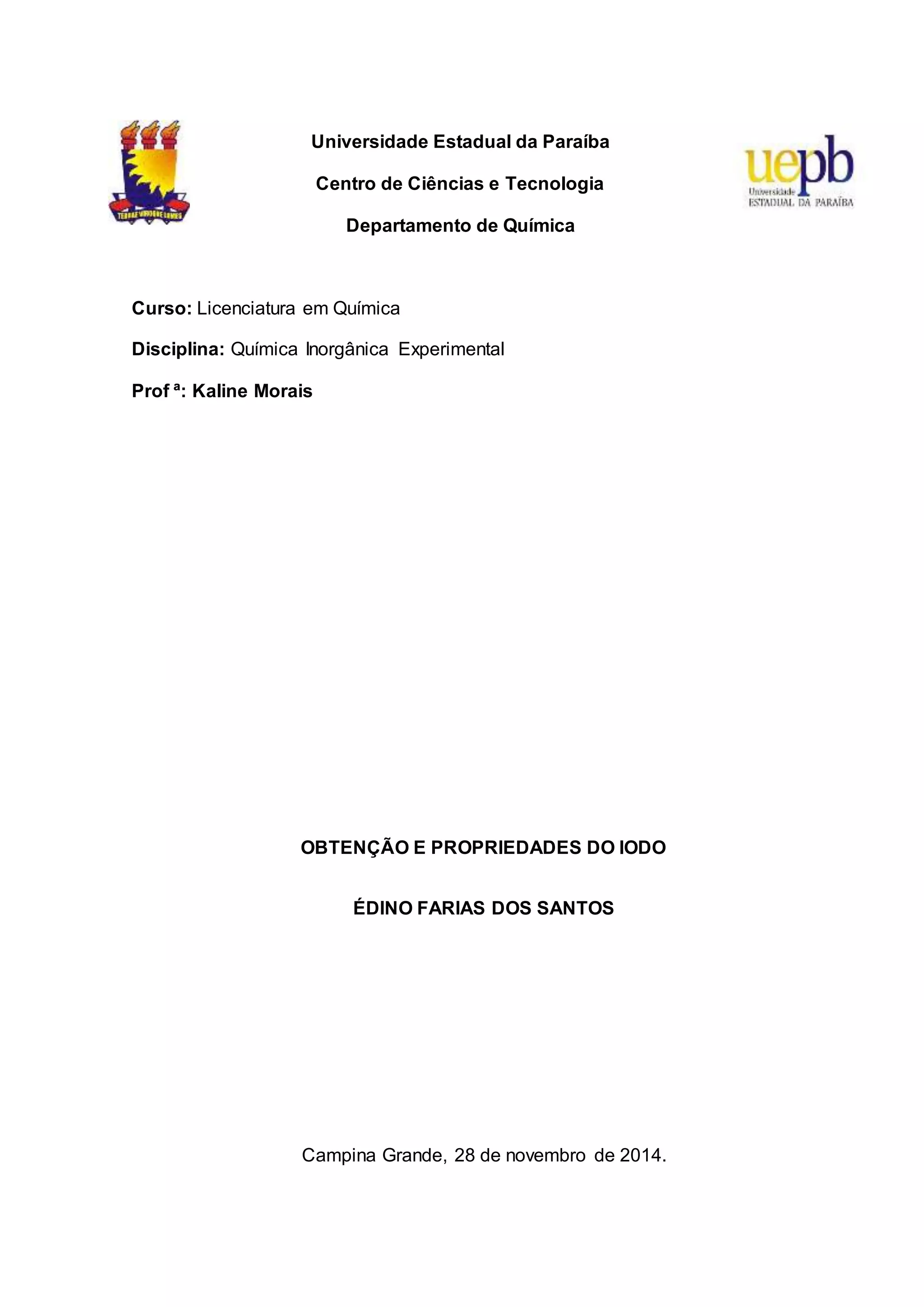 O documento descreve um experimento para obter e identificar as propriedades do iodo. O iodo foi obtido através da reação de iodeto de potássio com diferentes oxidantes como MnO2, KMnO4 e K2Cr2O7. Em seguida, testou-se a solubilidade do iodo em diferentes solventes como água, álcool etílico, benzeno e clorofórmio. O iodo mostrou-se solúvel nos solventes apolares e insolúvel na água polar.