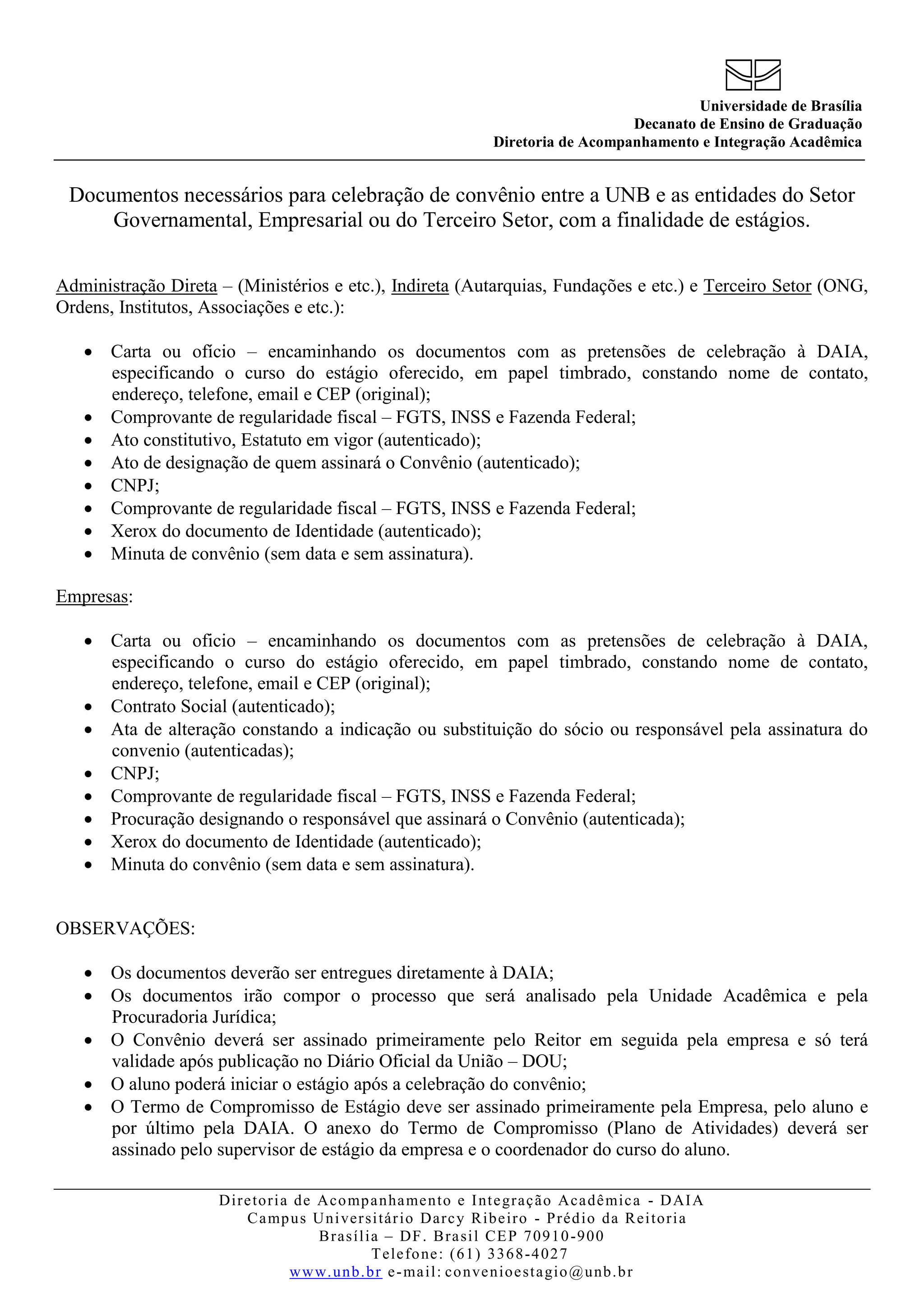 Este documento lista os documentos necessários para a celebração de convênios entre a Universidade de Brasília e entidades do setor governamental, empresarial ou do terceiro setor para fins de estágio. Para entidades governamentais e do terceiro setor são necessários documentos como carta, comprovantes de regularidade fiscal, atos constitutivos e estatutos. Para empresas privadas, são exigidos documentos como contrato social, comprovantes fiscais, procuração e minuta do convênio.