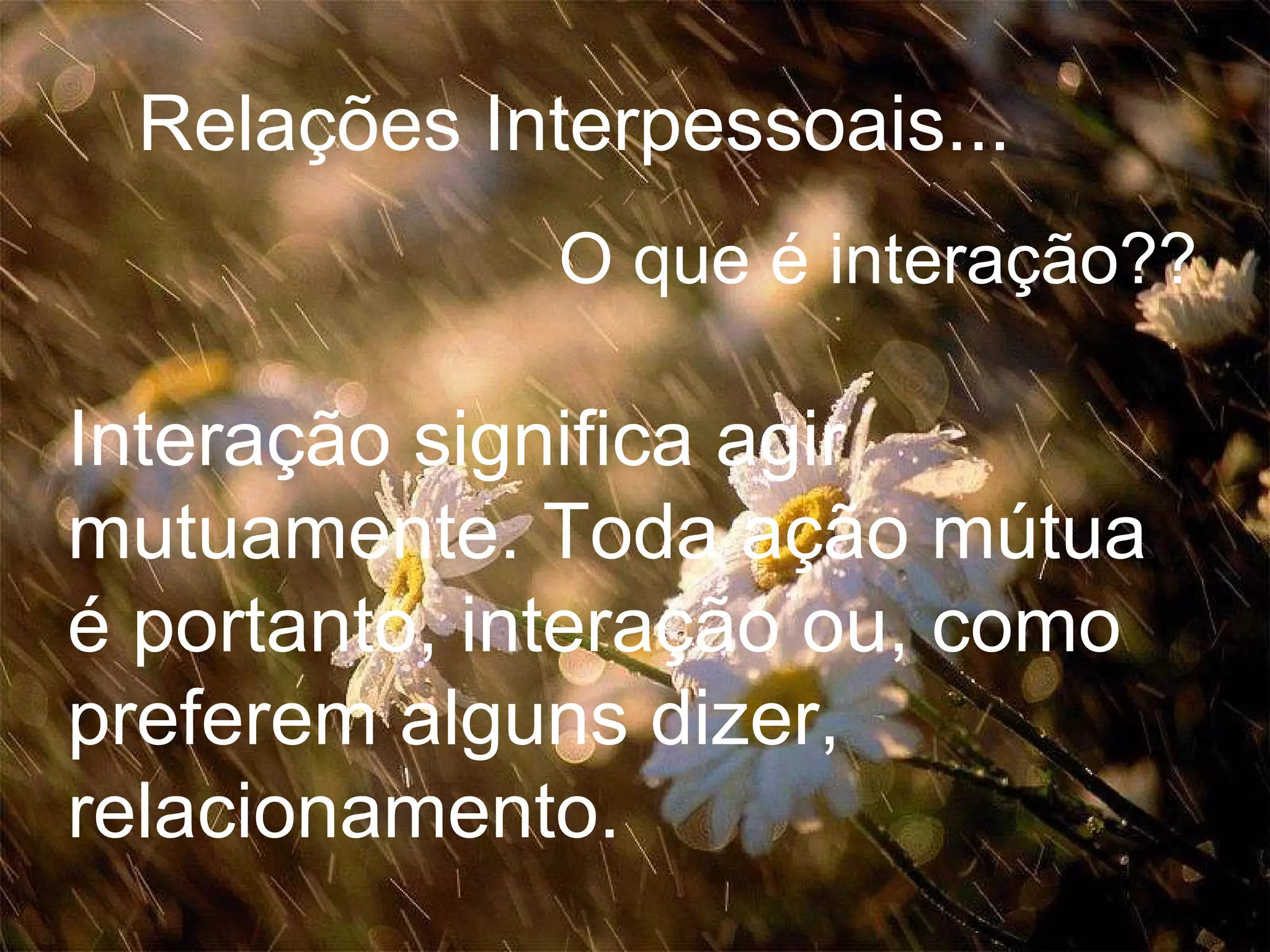 O documento discute conceitos de relações interpessoais e influência social. Aborda temas como interação, estereótipos, preconceitos, conformidade grupal, pressão social, necessidades humanas e a possibilidade de mudança comportamental. Destaca que a compreensão do próprio comportamento é essencial para entender a resistência dos outros em mudar.