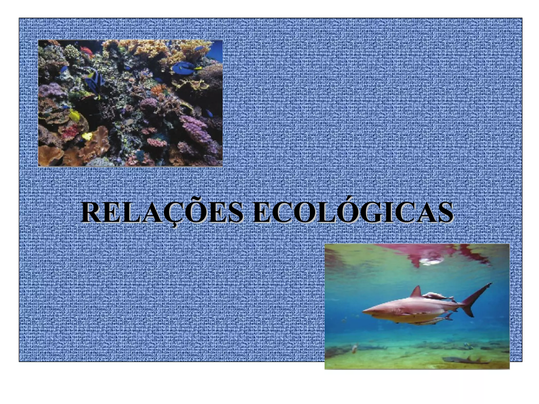 O documento descreve as principais relações ecológicas entre espécies em um ecossistema, incluindo relações harmônicas como mutualismo e comensalismo e relações desarmônicas como competição, predação e parasitismo. Ele fornece exemplos de cada tipo de relação e explica como elas podem resultar em benefícios ou prejuízos para as espécies envolvidas.