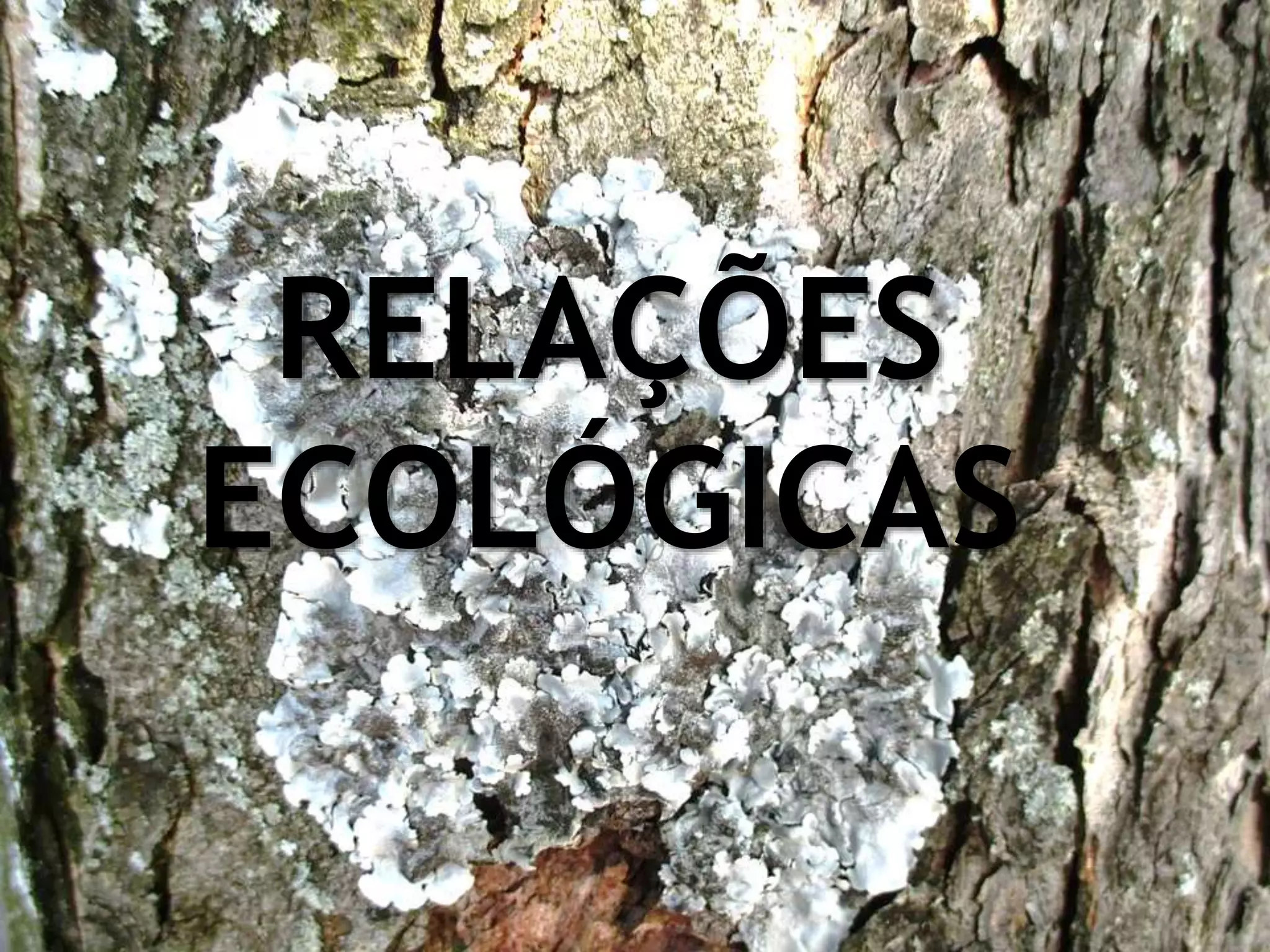 O documento discute as diferentes relações ecológicas entre os seres vivos, incluindo relações intraespecíficas (dentro da mesma espécie) e interespecíficas (entre espécies diferentes). As relações intraespecíficas podem ser harmônicas, como colônias e sociedades, ou desarmônicas, como canibalismo e competição. As relações interespecíficas podem ser harmônicas, como mutualismo, comensalismo e inquilinismo, ou desarmônicas, como predatismo, paras