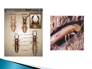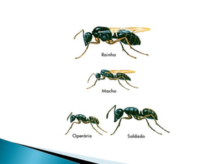 O documento descreve diferentes tipos de relações entre indivíduos de uma mesma espécie e entre espécies diferentes, incluindo relações harmônicas e desarmônicas, sociedades isomorfas e heteromorfas, e interações como competição, mutualismo, protocooperação, inquilinismo, comensalismo, amensalismo, predatismo e parasitismo. Exemplos de cada tipo de relação são fornecidos.