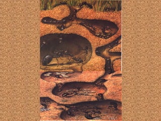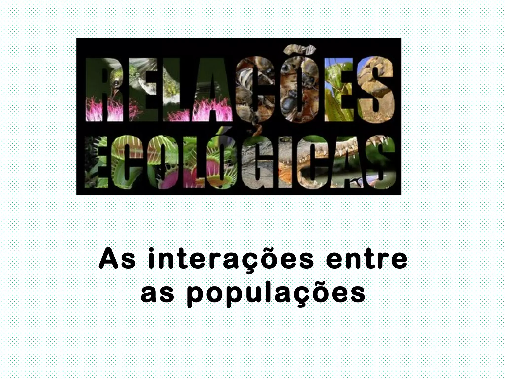 O documento descreve as principais relações ecológicas entre populações, incluindo relações harmônicas como mutualismo, comensalismo e inquilinismo, e relações desarmônicas como competição, canibalismo e parasitismo. Ele também fornece exemplos detalhados de sociedades de insetos como abelhas, formigas e cupins.