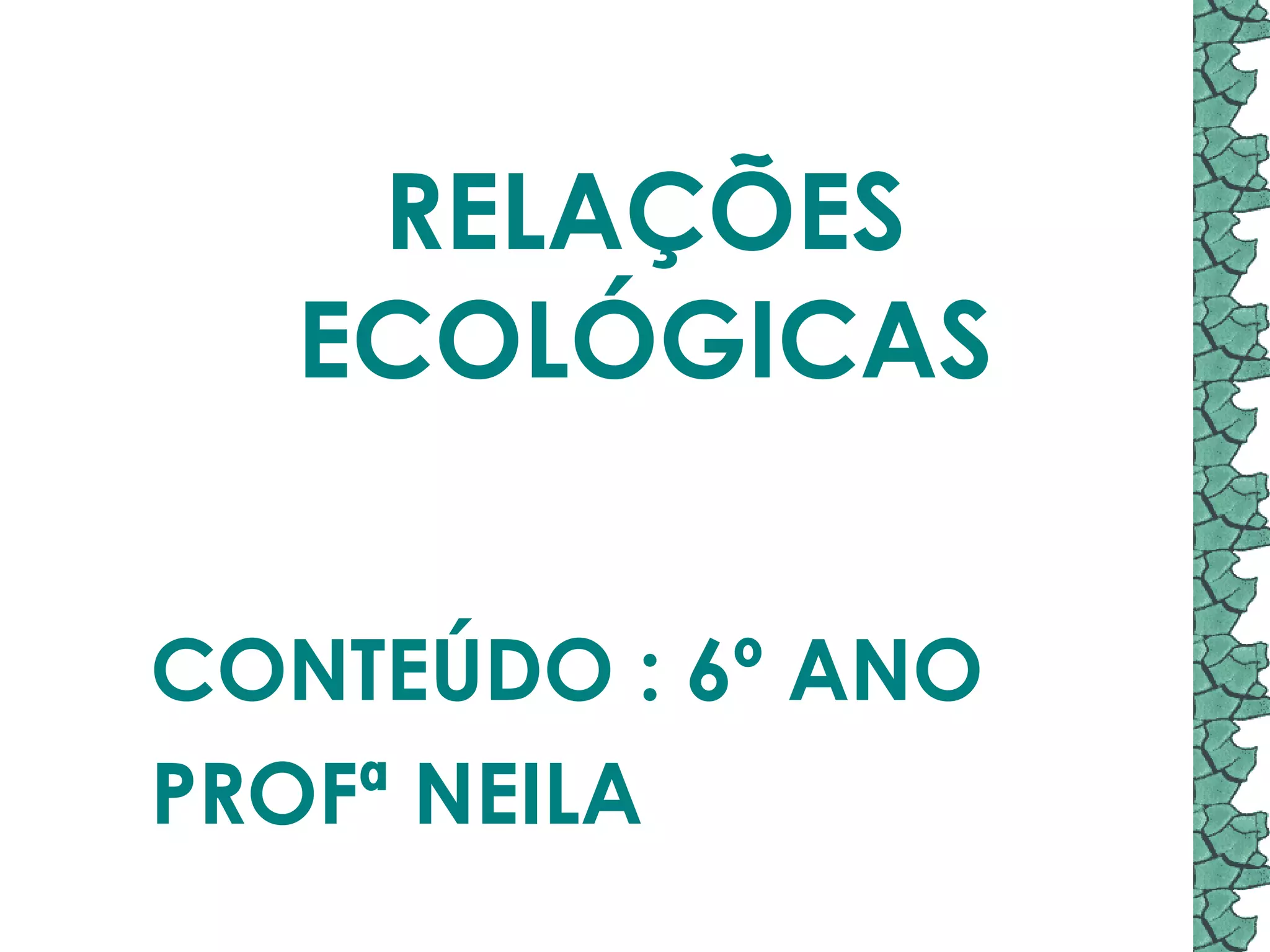 O documento discute as relações ecológicas entre espécies em um ecossistema. Ele explica que a competição ocorre quando espécies disputam recursos como alimento e abrigo, e pode levar à extinção de espécies menos adaptadas. Também descreve relações harmônicas como sociedade e colônia, e relações desarmônicas como competição, canibalismo e parasitismo.
