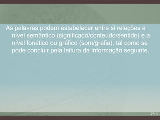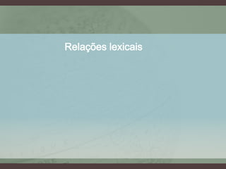 As palavras podem ter relações semânticas e fonéticas/gráficas. As relações semânticas incluem sinonímia, antonímia, hierarquia e inclusão. As relações fonéticas/gráficas incluem homonímia, homofonia, homografia e paronímia. Muitas palavras também são polissêmicas, tendo vários significados.