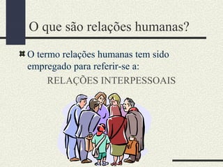 O documento discute o conceito de relações humanas, definindo-o como as interações entre indivíduos e grupos. Ele explica que as relações humanas envolvem comunicação interpessoal e intrapessoal e podem ocorrer no ambiente de trabalho, escola ou comunidade. Além disso, destaca a importância da empatia e flexibilidade no comportamento para se ter boas relações interpessoais.