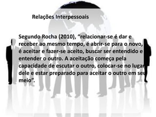 O documento discute relações interpessoais, comunicação e equipes de trabalho. Segundo os autores, relacionar-se é dar e receber, abrir-se para o outro e aceitá-lo. A comunicação é a troca de informações que mantém as pessoas em contato. Barreiras como diferenças de percepção dificultam a comunicação no ambiente de trabalho e na vida pessoal. Comportamentos como autoritarismo e antagonismo prejudicam equipes de trabalho.