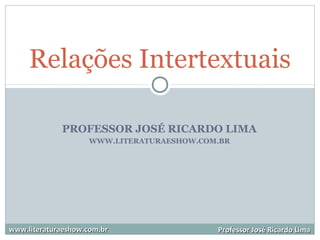 O documento discute as relações intertextuais entre textos literários, definindo intertextualidade e apresentando os principais tipos: alusão, citação, epígrafe, paráfrase e paródia. Também analisa exemplos de intertextualidade na Canção do Exílio de Casemiro de Abreu e em outras obras que fazem referência a ela.