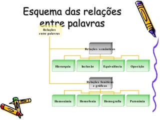 Este documento descreve os principais tipos de relações entre palavras, incluindo relações semânticas (hierarquia, inclusão, equivalência, oposição), e relações fonéticas e gráficas (homonímia, homofonia, homografia, paronímia). Fornece exemplos de cada tipo de relação e explica como elas funcionam.
