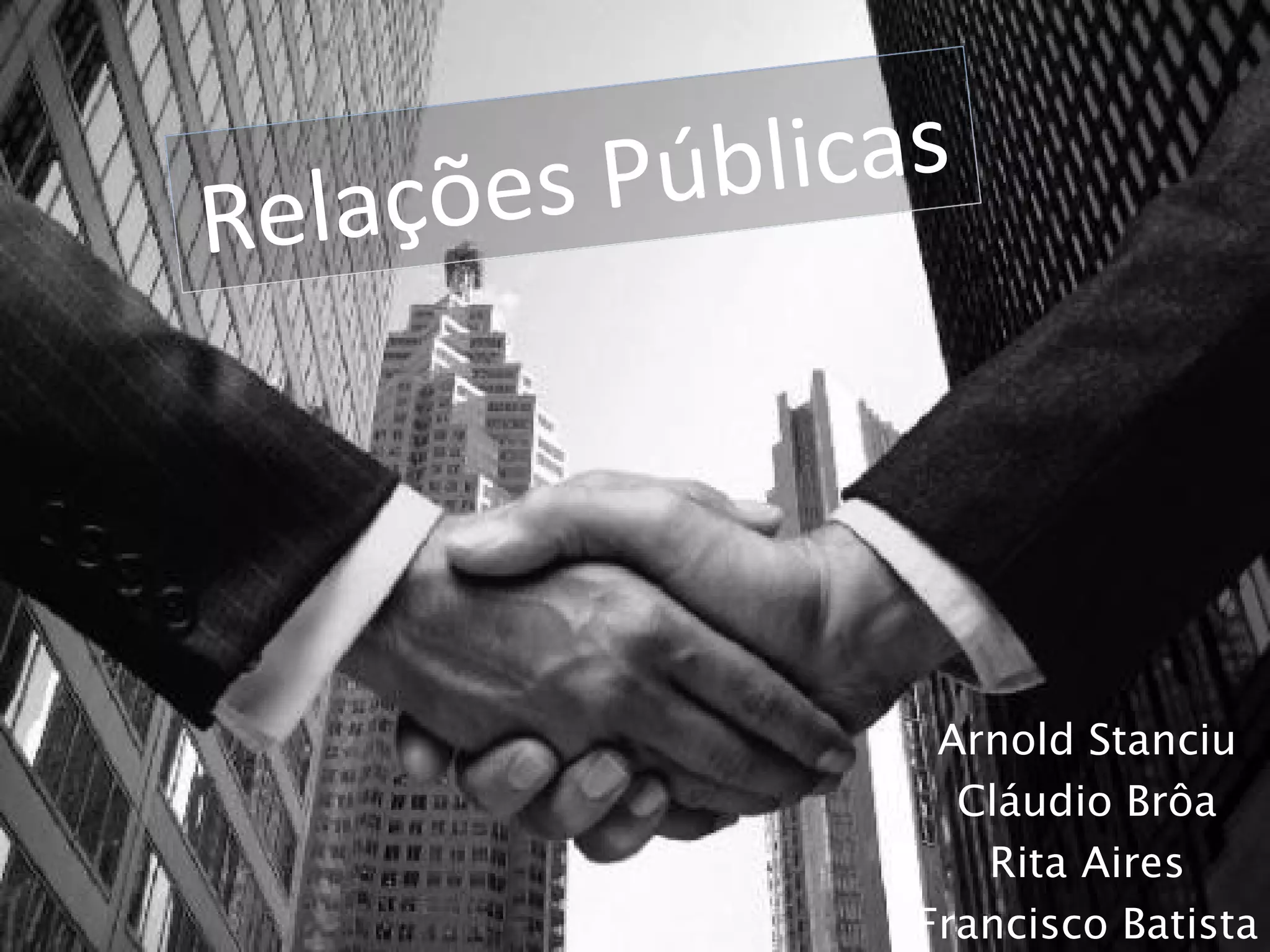 O documento discute vários tipos de relações públicas, incluindo relações comunitárias, internacionais, com órgãos de comunicação social, governamentais, com consumidores, internas e financeiras. Ele explica que as relações públicas visam principalmente divulgar uma boa imagem de uma organização e estabelecer compreensão mútua através de comunicação bilateral.