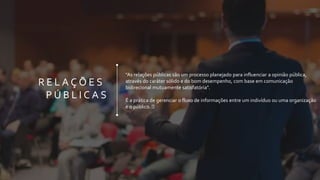 O documento discute as relações públicas, definindo-as como um processo planejado de influenciar a opinião pública através de comunicação bidirecional. Ele descreve as principais funções das relações públicas como promoção, serviço, imagem corporativa e comunicação. Por fim, discute os desafios de quantificar os benefícios das relações públicas e a falta de controle sobre os resultados.