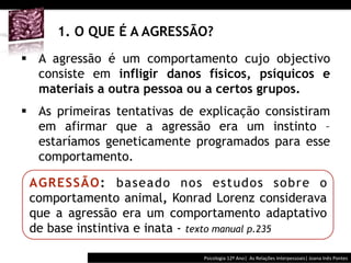 The document discusses aggression and conflict between groups. It describes aggression as behavior intended to harm others and examines biological, psychological and social factors influencing aggression. It also discusses how competition and perceptions of unfair treatment can lead to conflict between groups and different ways of resolving conflicts, including increased contact and cooperation between groups.