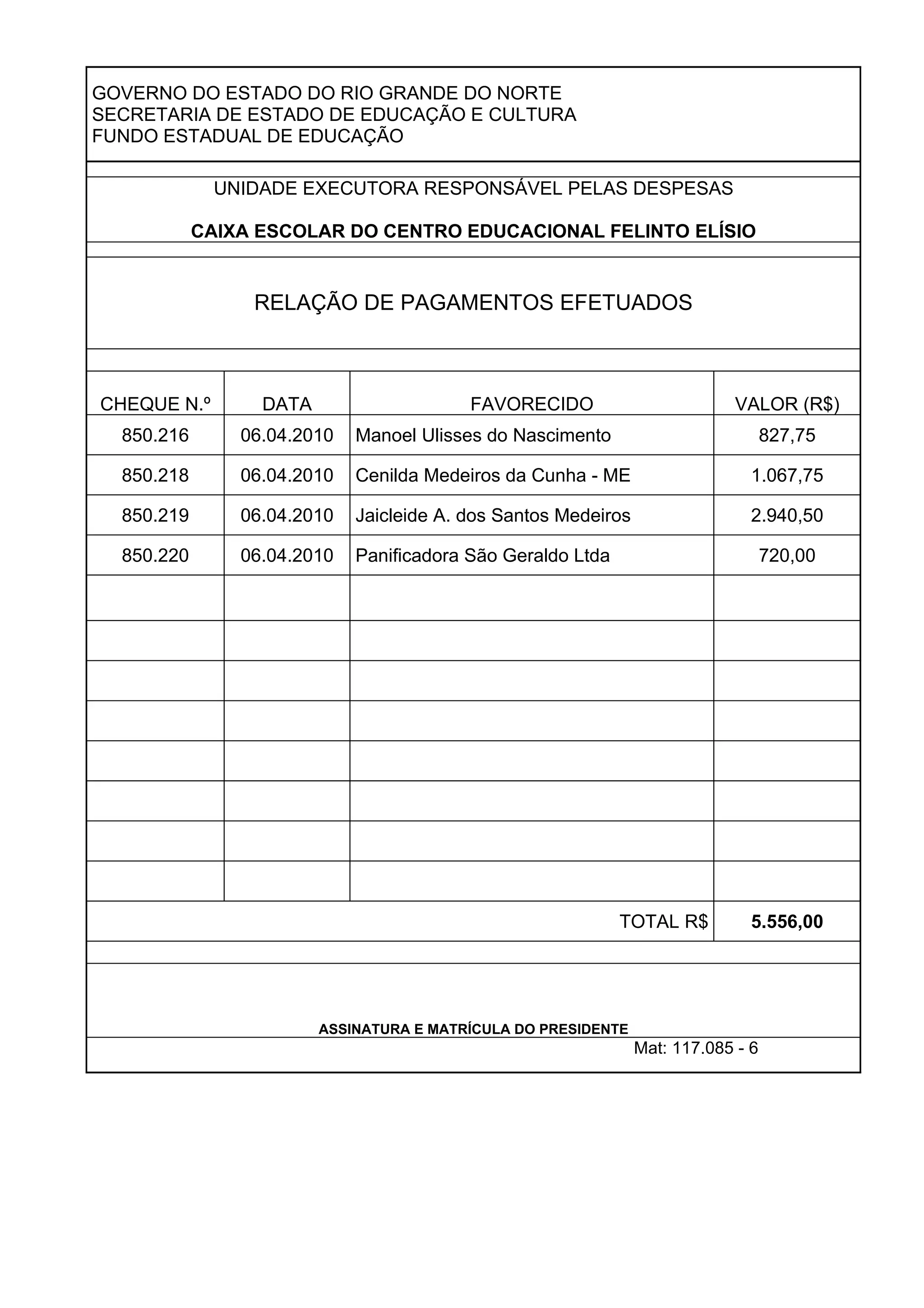 Este documento fornece uma relação de pagamentos efetuados pela Caixa Escolar do Centro Educacional Felinto Elísio. Ele lista 4 cheques emitidos em 6 de abril de 2010 para Manoel Ulisses do Nascimento, Cenilda Medeiros da Cunha - ME, Jaicleide A. dos Santos Medeiros e Panificadora São Geraldo Ltda, totalizando R$ 5.556,00 em pagamentos.