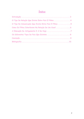 Este documento discute as relações entre pais e filhos, incluindo os tipos de relações, comunicação, como filhos afetam casais, e tipos de pais. Ele também contrasta a educação antiga versus moderna.