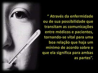 O documento discute as diferentes perspectivas dos médicos e pacientes sobre saúde e doença. Médicos tendem a se concentrar nos aspectos físicos e objetivos, enquanto pacientes também buscam conforto para suas angústias e sensações. Quando os pacientes insistem em se queixar sem achados físicos, os médicos muitas vezes os dispensam como portadores de manias. É importante que médicos compreendam as necessidades subjetivas dos pacientes para evitar exacerbar suas queixas.