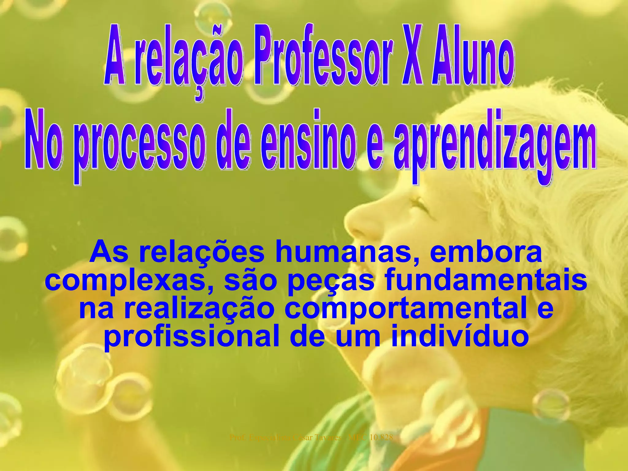 O documento discute a relação entre professor e aluno no processo de ensino-aprendizagem. Aponta que essa relação envolve interesses e intenções de ambos e caracteriza-se pela seleção e organização de conteúdos pelo professor visando facilitar a aprendizagem dos alunos. Também ressalta a importância do diálogo e da empatia na motivação dos alunos, para que o aprender se torne mais interessante.
