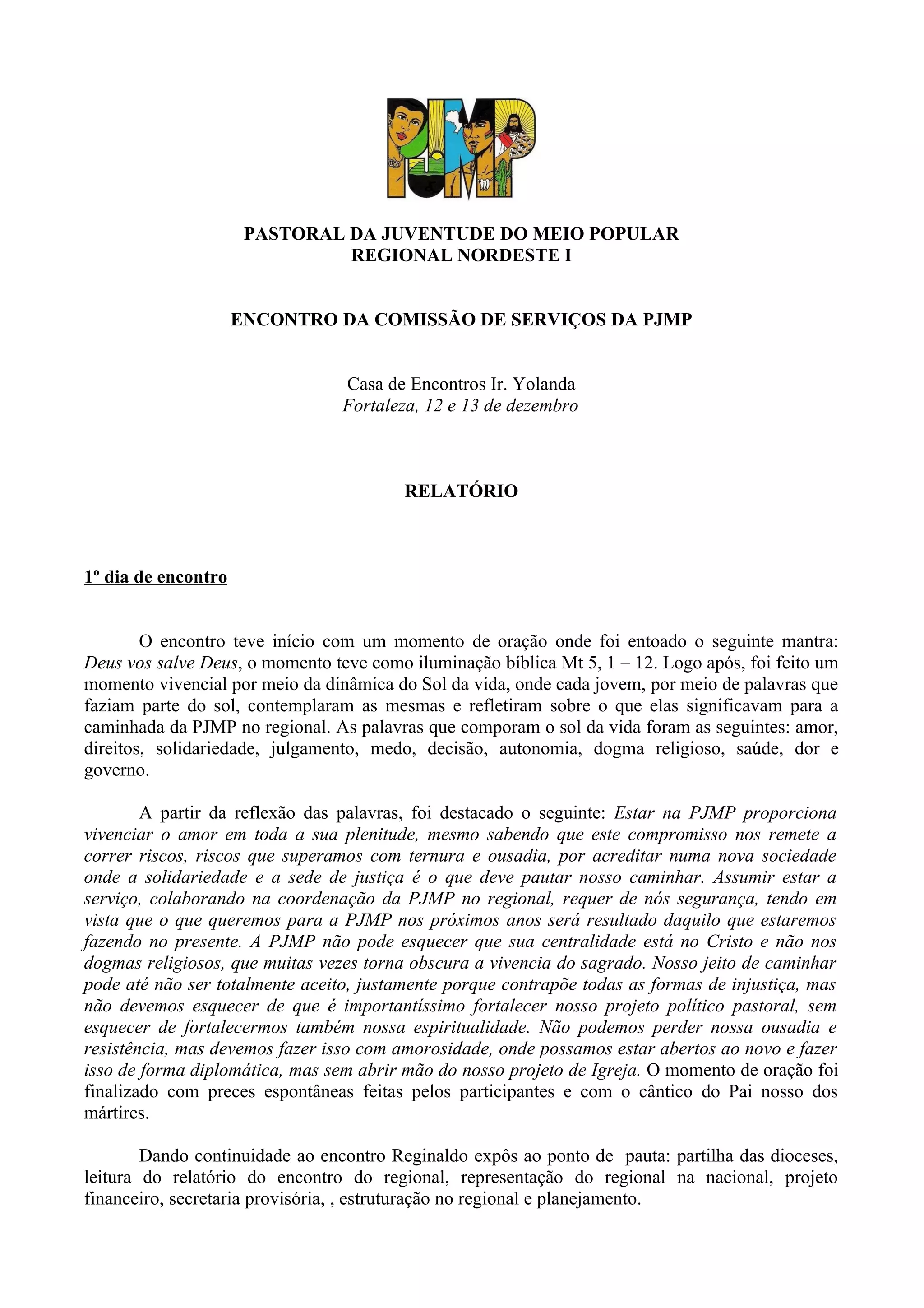 O documento relata o primeiro dia de encontro da Comissão de Serviços da Pastoral da Juventude do Meio Popular Regional Nordeste I. Os principais pontos discutidos foram: a estruturação da PJMP no regional com a criação de equipes temáticas; a indicação de Laudiano como secretário regional provisório; e estratégias para a sustentabilidade financeira da PJMP no regional, como a criação de um fundo solidário e a captação de recursos via projetos.
