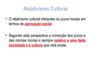 O documento discute o relativismo cultural e seus argumentos. O relativismo cultural defende que os juízos morais dependem da sociedade e cultura, variando entre elas. Isso promove a tolerância entre culturas, mas também o conformismo e impede a melhoria social. Há objeções, como o fato de maiorias poderem estar erradas e o relativismo não permitir criticar práticas de outras culturas.