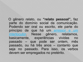 O documento discute as características do gênero relato pessoal. Explica que um relato narra experiências vividas no passado com o objetivo de transmiti-las a outras pessoas, e que pode ser apresentado oralmente ou por escrito em diferentes situações e meios, como revistas, jornais e redes sociais.