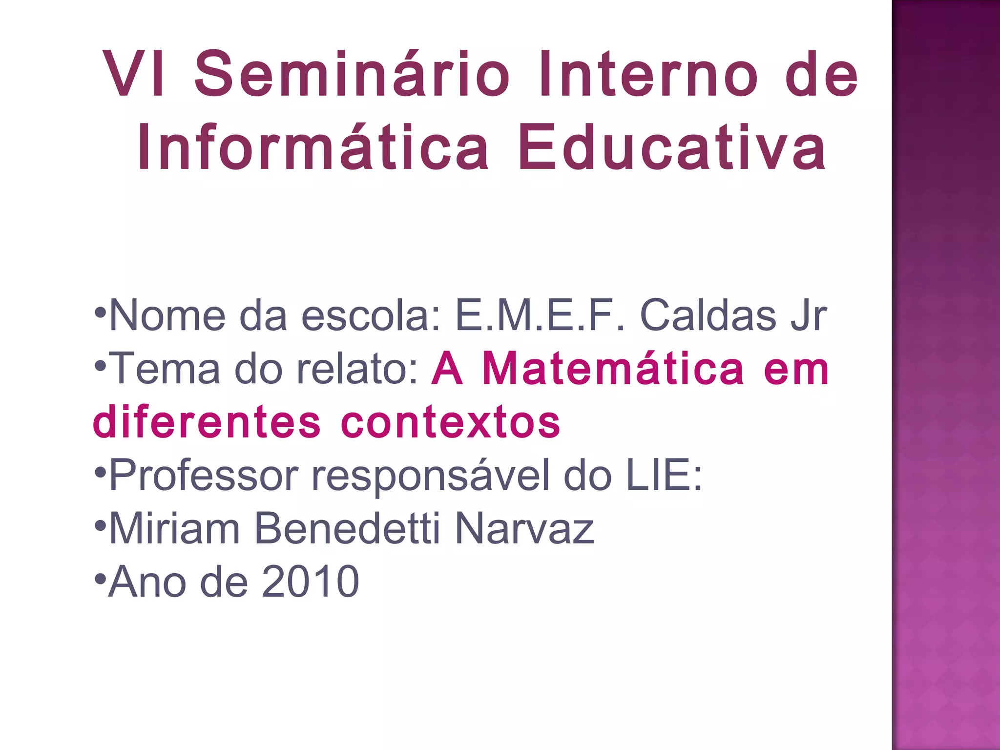 Este documento resume um projeto desenvolvido na escola E.M.E.F. Caldas Jr durante o primeiro e segundo trimestre de 2010, envolvendo alunos de 8a série em atividades que trabalharam conteúdos de matemática em diferentes contextos como culinária e tecnologia. O objetivo foi desenvolver a criatividade e independência dos alunos ao aplicar conhecimentos matemáticos em situações do cotidiano. As etapas incluíram pesquisa, produção de livros de receitas, atividades práticas na cozinha