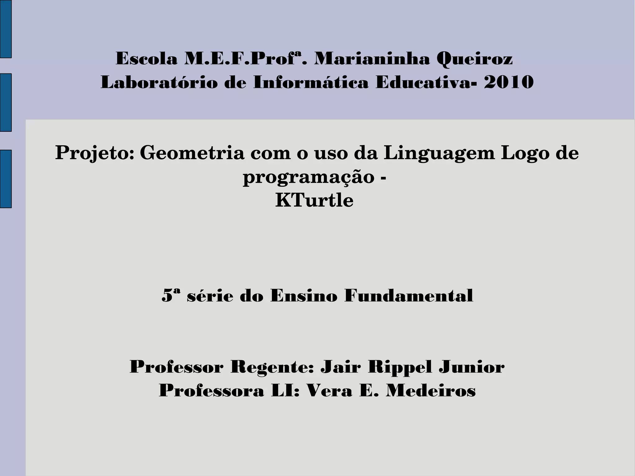 O projeto ensinou conceitos geométricos de ângulos e medidas para alunos da 5a série usando a linguagem de programação Logo no programa KTurtle; os alunos aprenderam comandos básicos como para frente e para trás para criar figuras geométricas e rosáceas; a avaliação mostrou que o projeto desafiou os alunos e os motivou no aprendizado de lógica de programação.