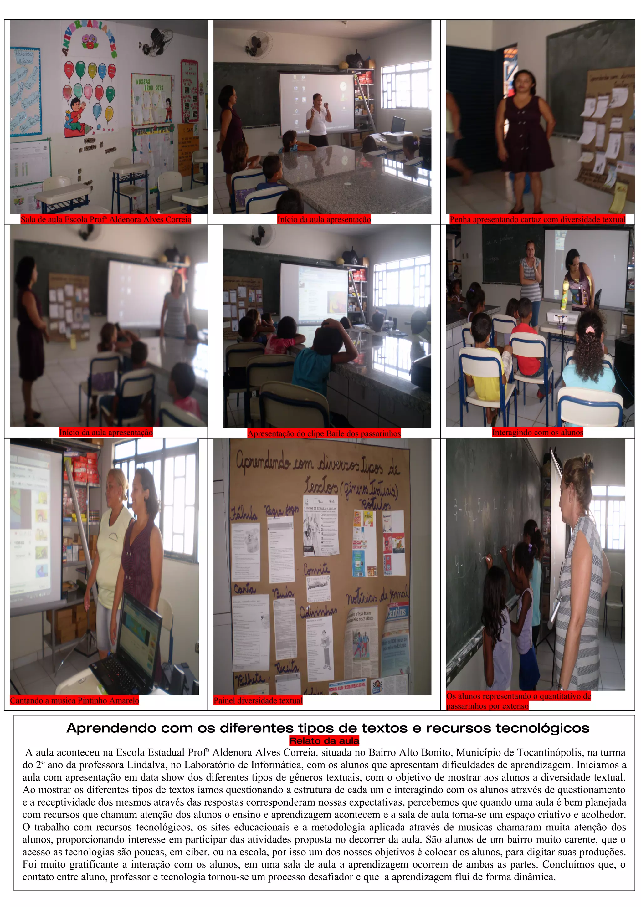 Na aula na Escola Estadual Profa Aldenora Alves Correia, os alunos aprenderam sobre diversos tipos de textos por meio de apresentações em data show e músicas. Eles representaram quantidades numéricas por extenso e mostraram interesse em participar das atividades planejadas, como digitar suas próprias produções. A interação entre alunos, professora e tecnologia proporcionou um processo de aprendizagem dinâmico e gratificante.