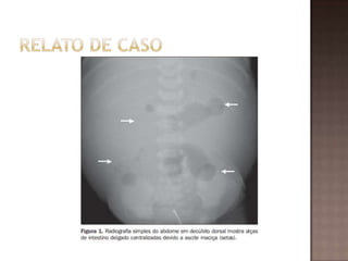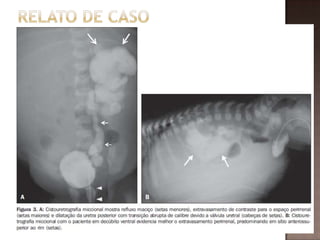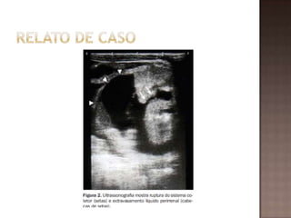 Este documento descreve o caso de um recém-nascido do sexo masculino que apresentou ascite e foi diagnosticado com ruptura de cálice renal esquerdo após exames de imagem. O bebê foi submetido a ureterostomia cutânea bilateral e cistoscopia e teve boa evolução após o tratamento.
